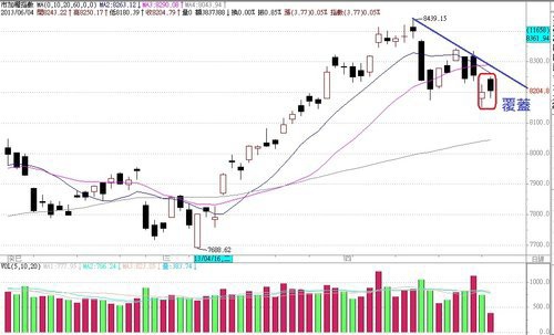 昨日加權開高走低收覆蓋線 有吞噬6/3 底部拉抬紅K的味道,以加權來看我會想放空