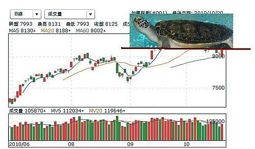 撇開籌碼不看 , 指數季線強力反彈又回到8000~8400的整理區域 , 兩隻紅色條阿腳撐著上面那隻綠蠵龜 . 柱子被砍斷則綠蠵龜摔下桌 , 不然就是這樣撐著 .