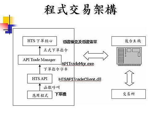 HTS 裡可以撰寫買賣信號 根據此買賣信號在線圖上標註買進害賣出的點 , 如果可以根據此買賣點自動作交易就簡單多了 . 問題是不行 . 所以必須由另外一台 "下單機" 來做此下單的動作 . 而 日盛HTS 下單系統如何和 外來的 下單機做溝通 ?? 答案就是 日盛HTS系統 將買出賣出的訊號 寫進一個文字檔 , 然後另一個獨立的下單機去讀取此文字檔 , 將文字檔的文字 透過呼叫HTSAPITradClient.dll 裡的函數 組成下單的字串 , 再把字串傳給 執行檔 APITradeMgr.exe , APITradeMgr.exe 會再把下單指令字串改成正式的下單指令 , 經帳號密碼憑證驗證無誤後 , 透過網路將下單的指令傳給日盛主機 , 日盛主機再傳給交易所 . 這裡寫的是完整的運作流程 , 但是對於投資人來講也不見得要懂這麼細 . 只要會用工具就好 .