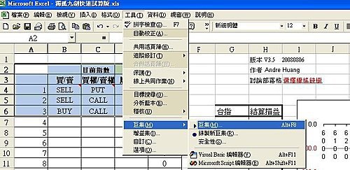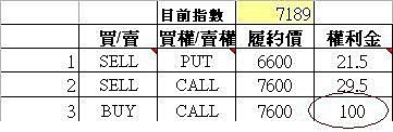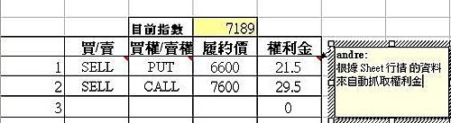 沒有打權利金的部分 (SELL PUT 6600 和 SELL CALL 7600 ) , 只要EXCEL行情更新 , 其權利金就會自己更新不用再慢慢敲了 . 有打權利金的部份 (BUY CALL 7400和BUY PUT 6800) , 因為公式已被你洗掉 , 不會修改你的值 .