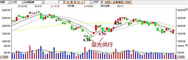 這個圖的走勢也是一樣,台股加權指數,大盤上漲之前量已經悄悄上升了。上漲要用力,需要主力的實質買盤。