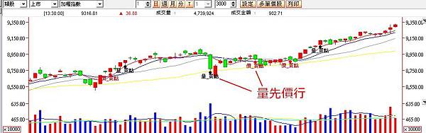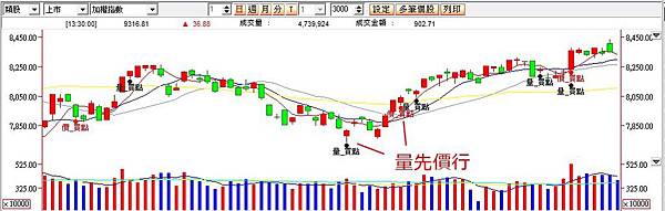 可以看到很多的走勢在上漲的起始段都是先出現 "量買點" 才出現 "價買點",所以我取名為【量先價行指標】