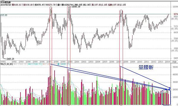 而現在2014年攻上9300的十日均量只有1000億。只有2007的六成二。